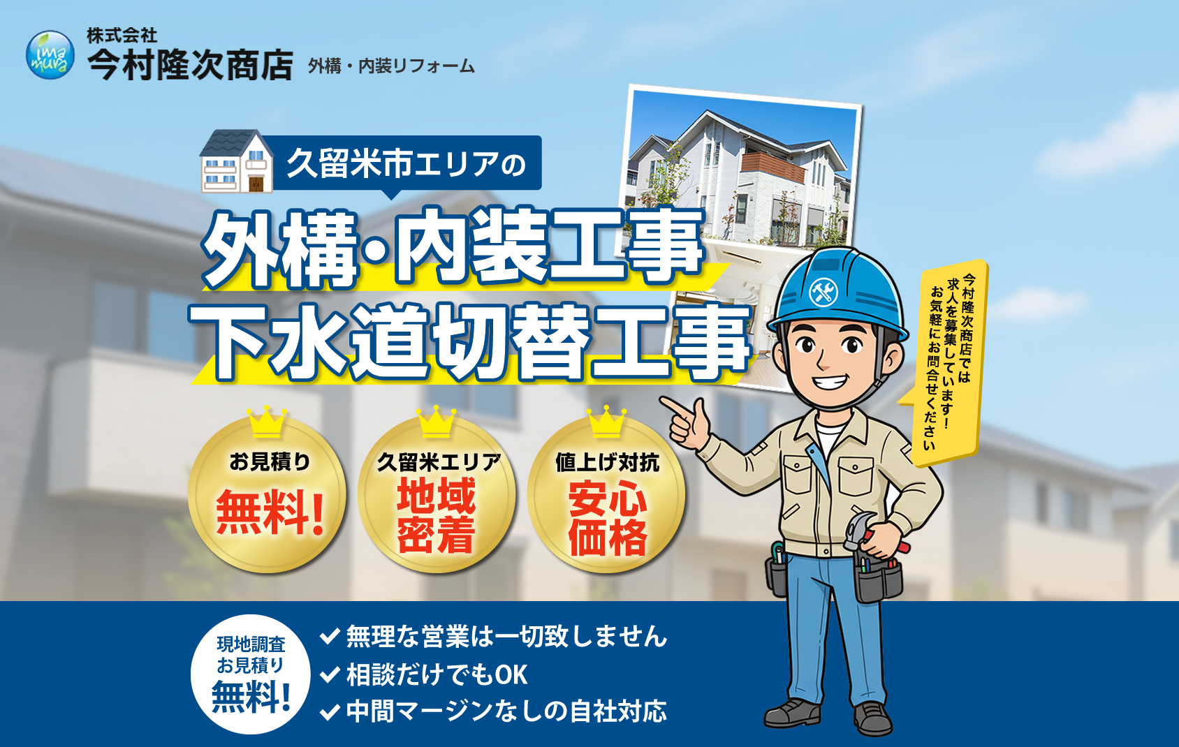 久留米市、筑後市、大川市、柳川市エリアで外壁・内装工事、下水道切替工事などお住まいに関しては今村隆次商店にお任せください。リフォームから建具の調節や手すりの取り付けといった小さなご依頼まで幅広く対応可能です。ハウスメーカーで断られた工事でも柔軟に対応しますので、まずは一度ご相談ください!ご相談・お見積もりは無料です。法人さま・個人さまを問わず、ご連絡をお待ちしております!